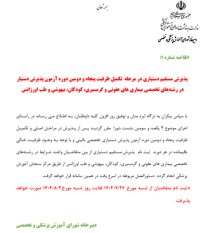 اطلاعیه ثبت نام پذیرش مستقیم دستیاری