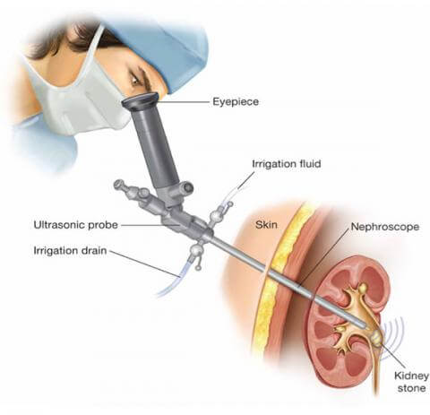 این عمل با بیحسی نخاعی و یا بیهوشی عمومی انجام می شود و با استفاده از سیستم عکسبرداری در اطاق عمل یک عدد سوزن وارد کلیه شده و مسیر را بدون برش جراحی وسیع فقط ، با عبور دوربین سنگها خرد و با پنس خارج می شوند.